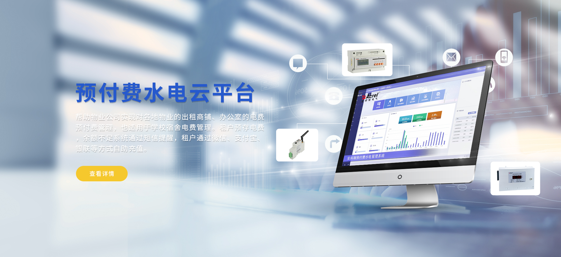 安科瑞提供的解決方案包括Acrel-EIoT能源物聯網云平臺變電所運維云平臺、安全用電管理云平臺、環保用電監管云平臺、智慧消防云平臺、能源管理云平臺、工業企業能源管控平臺、遠程預付費云平臺、餐飲油煙監管云平臺、電動汽車/電瓶車充電樁收費管理云平臺、電力監控/無線測溫系統、電能質量治理系統、電氣火災監控系統、消防設備電源監控系統防火門監控系統、應急照明和疏散指示系統、智能照明控制系統、醫用隔離電源絕緣監測系統等,幫助用戶實現能源智能化、可視化、精細化管理,提高用能效率和用能安全,為企業節能降耗和實現能源數字化建設提供數據服務。